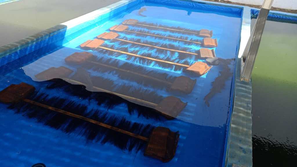 Pindahkan juga kakaban ke kolam penetasan dengan cara dibalik (bagian atas saat di kolam pemijahan dibalik menjadi bagian bawah di kolam penetasan)